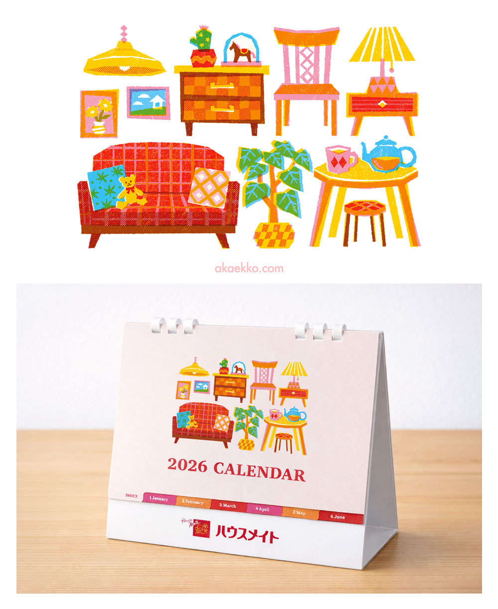 ハウスメイトグループ 2026年卓上カレンダーの表紙を描かせていただきました。 ハウスメイトグループ様のロゴマークに使用されているピンクやイエロー系の暖色を使用し、お部屋づくりが楽しみになるようなあたたかい雰囲気のイラストを描かせていただきました。 ※イラストをクリックすると拡大します