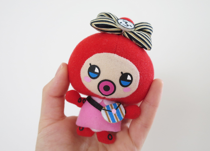「ふ」の字のリボンをしたタコ。なので「ふタコ」。双子織(ふたこおり)という名称認知のためにネーミングからキャラクターを考えました。双子織で作られたリボンと鞄を身につけておめかししています。