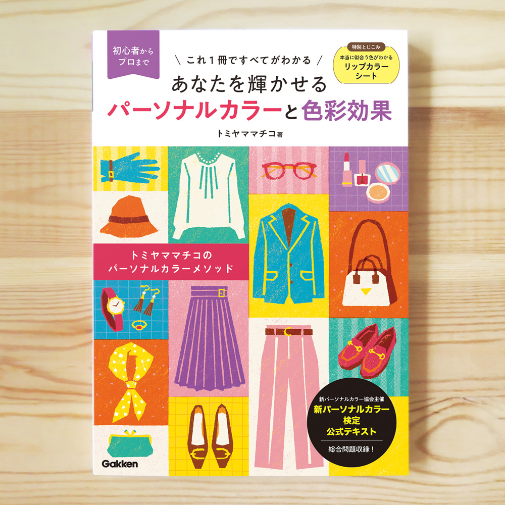 Gakken 新パーソナルカラー検定 公式テキスト「あなたを輝かせるパーソナルカラーと色彩効果」(トミヤママチコ様著)の表紙を描かせていただきました。 色のテキスト本なので配色にこだわり、店頭で目立つようカラフルに仕上げました。